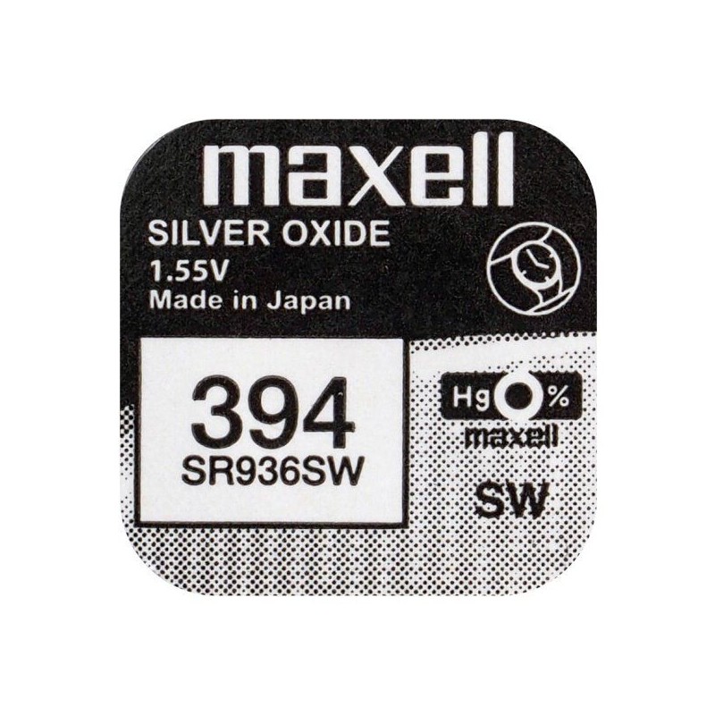 Maxell 394/SR936/AG9 е сребърна батерия за часовник, с напрежение от 1.5V. Периодът й на издръжливост е между 1 год. и 1,5 год.